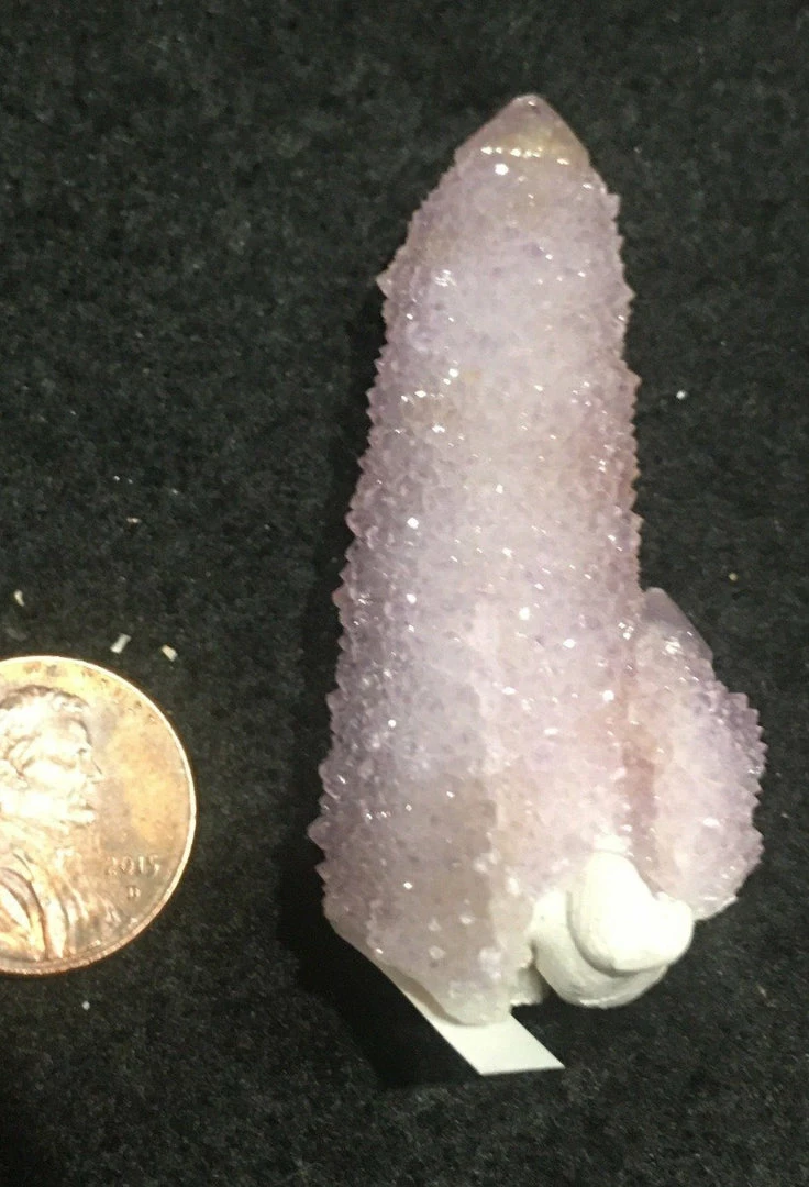 Spirit Quartz is an unusual member of the Quartz family – a community within a stone. Its core, a larger, candle-shaped crystal with a faceted termination point, is encrusted with hundreds of smaller crystal termination points. Also referred to as Cactus Quartz or Porcupine Quartz, it is found only in the Magaliesberg Mountain region of South Africa, first appearing around 2001. Most Spirit Quartz is Amethyst, though Citrine, Smokey, and White Quartz are also mined. [Simmons, 375][Ahsian, 376]
