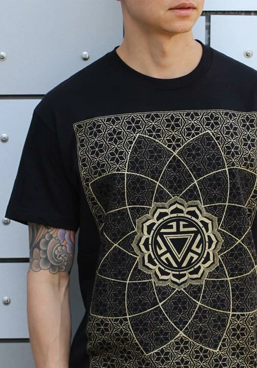 “Vitality” printed in gold ink on a various shirt colors. This design consist of the Manipura Chakra, which is the centre of vitality. It controls our energy balance to strengthen our health. Mixed with repeated pattern elements and creating a full shirt screen print effect. Originally created for the infinity scarf and now available on shirts.