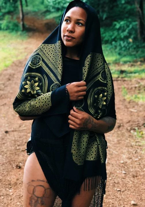 Our new Eternal Series Pashminas are now in stock! Printed on black Turkish cotton. This perfect weight, soft fabric casts the print well and feels amazing to the touch. We will have gold on black and gold on cream soon.
