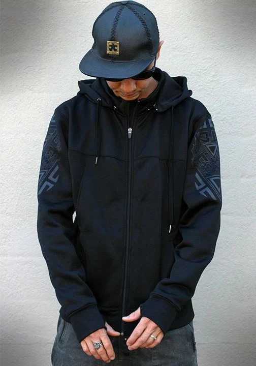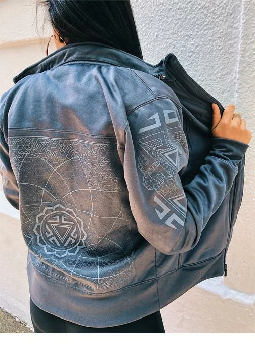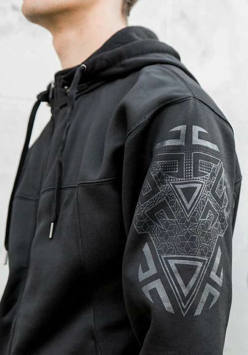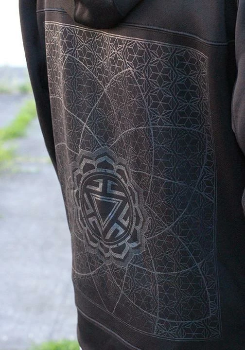 “Vitality” printed in black on black and grey on grey on our infamous ninja jacket. This design consist of the Manipura Chakra, which is the centre of vitality. It controls our energy balance to strengthen our health. Mixed with repeated pattern elements and creating a full shirt screen print effect. Printed in black ink to create a black on black look, and also available on grey and royal jackets.