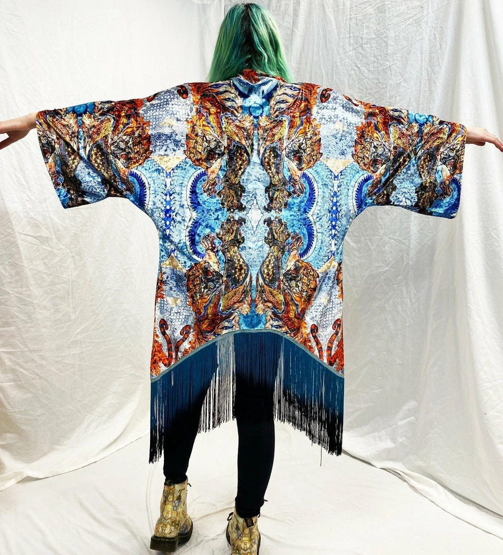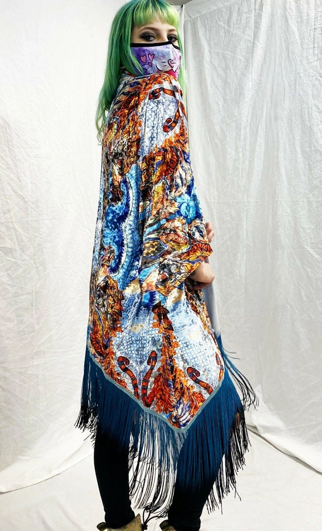 Fabric Features: Print Sheer Knit Dy-Sublimination, Hombre Fringe